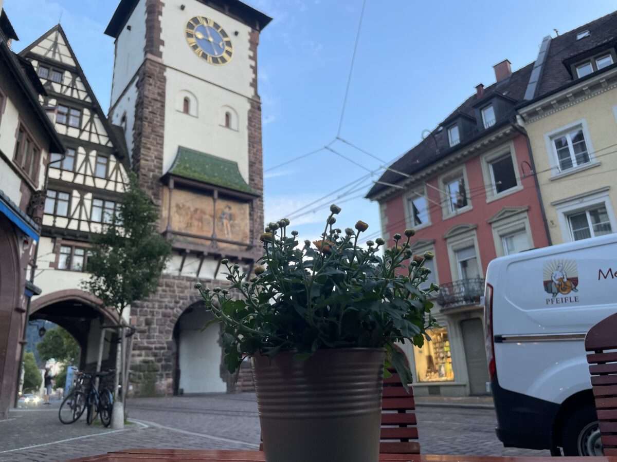 Das Couch-Surfing in einer fremden Wohnung birgt einige Überraschungen. Für meine Woche Schreibwerkstatt hatte ich mich bei Max, unserem Sohn, eingenistet. Er wohnt mit seiner Freundin mitten in der Stadt. Schlimmer noch, direkt vor einem der Stadttore, dem Schwabentor. Das Schlimme daran sind die Stadtführungen, die das Tor auf ihrem Programm haben. Also gibt es fast täglich bis zu vier Vorträge über das Tor, die Figuren auf dem Relief und deren Geschichte. Auf deutsch, englisch, französisch und spanisch. Gut, dass ich wenigstens den Vormittag im gemütlichen Weinbauort Pfaffenweiler verbringe. Ein Teil der Vorträge bleibt mir dadurch erspart. Komme ich mittags zurück und setze mich an meine Hausaufgabe, dann dringen durch die mehrfach verglasten Fenster nur gedämpfte Geräusche der Stadtführer, Telefonierer, Touristenschwärme, Lieferanten und Straßenbahnen.